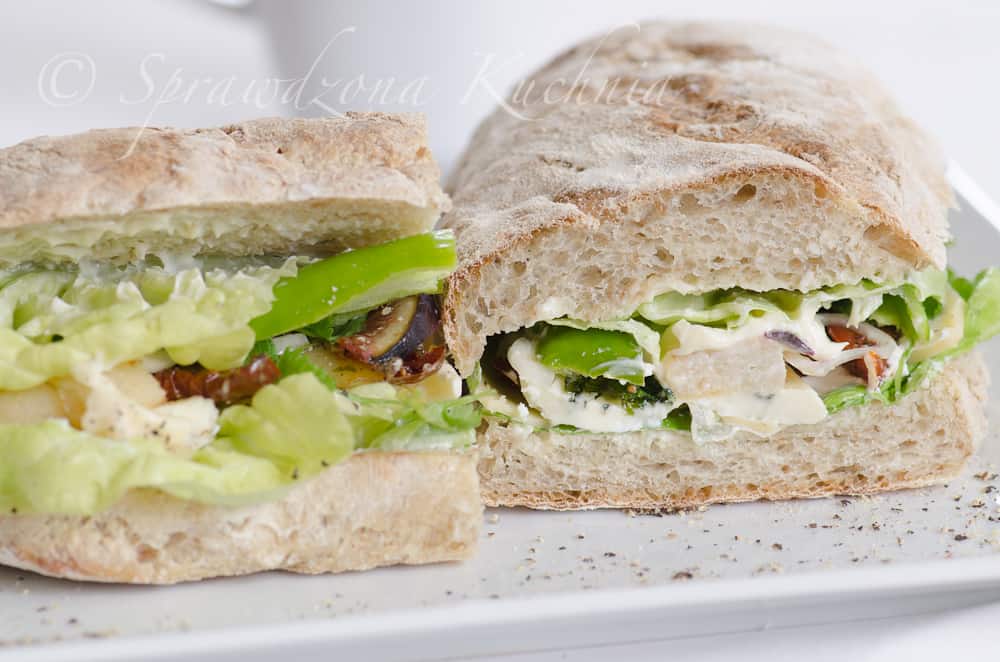 - Bagietkę posmarować majonezem. Położyć sałatę, ser, gruszkę, zrobić kilka małych kleksów z majonezu na gruszce. Następnie, figę, suszone pomidory, cienko pokroić i rozłożyć równomiernie na kanapce. Posypać listkami ziół i cienko pokrojona cebulą. Na górze kanapki położyć przekrojoną na pół paprykę. Posypać świeżo mielonym pieprzem. Dwie części bagietki złożyć razem, przekroić na dwie części.