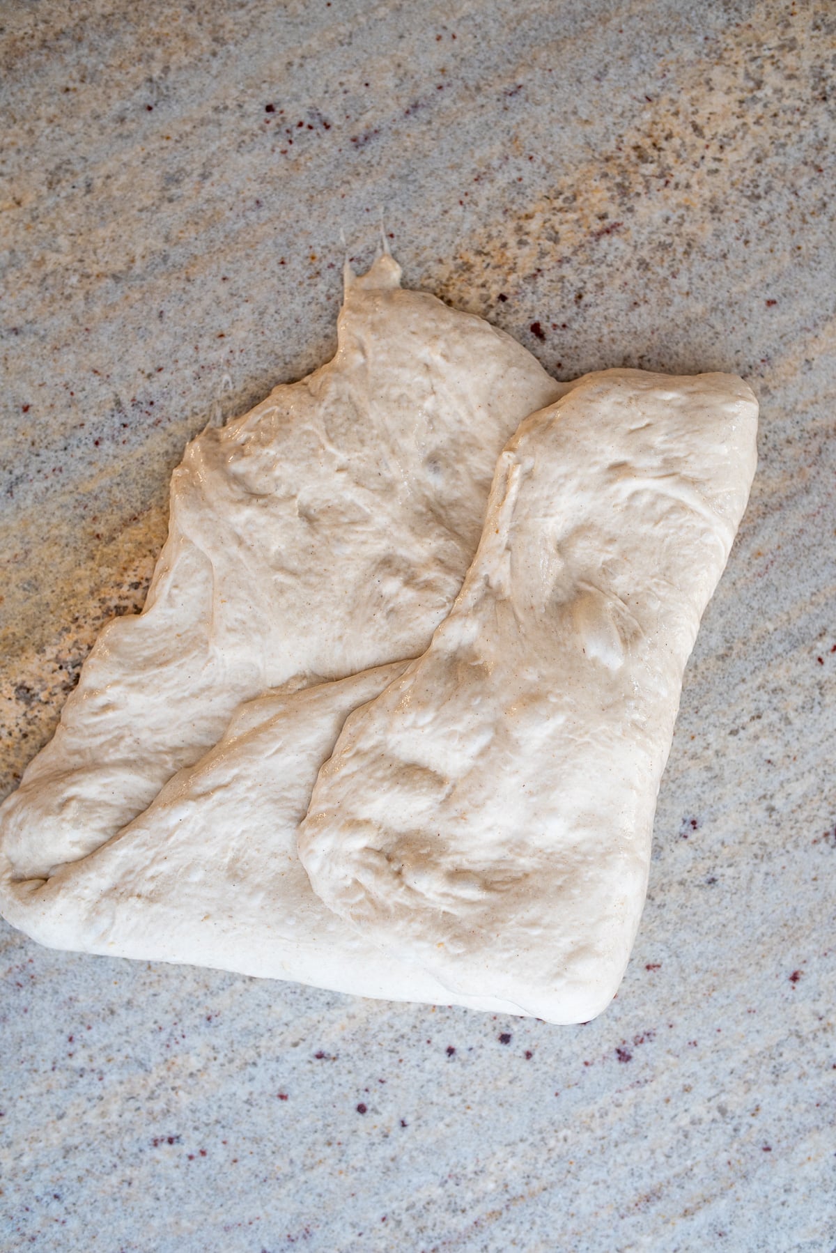 - Przystępując do składania ciasta warto zmoczyć dłonie, aby ciasto nie przyklejało się do nich.Po tym czasie ciasto należy złożyć, sięgamy na dno miski i chwytamy za ciasto, wyciągamy w górę, a następnie kładziemy wyciągniętą część na wierzch, tak postępujemy z czterech stron, przykrywamy miskę i odstawiamy na około 30 minut i powtarzamy składanie ciasta. Składanie powtarzamy jeszcze 2-3 razy. Przed ostatnim składaniem ciasto powinno niemal podwoić swoją objętość.