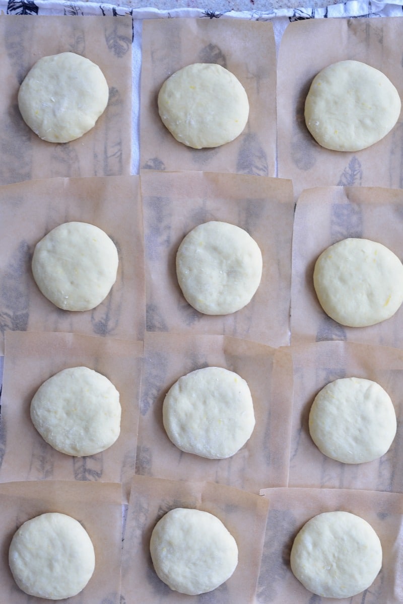 - Z papieru do pieczenia wyciąć kwadraty o wymiarach około 13x13 cm. Wyrośnięte ciasto wyjąć na blat odgazować, podzielić na 12 części, to wychodzi około 68 g na każdą porcję. Uformować okrągłe bułeczki, ułożyć je na kwadratach z papieru, lekko spłaszczyć, przykryć ściereczką i pozostawić na około 20 minut. Ja zastawiam je na blacie kuchennym, gdzie jest około 23 st C. Pilnujcie, żeby bułeczki nieprzerosły!!!